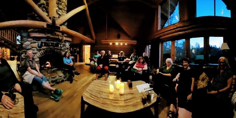 Twice a year Poul and I do a week-long writer's retreat in Port Alberni at the Riverside Lodge. Here we are at evening check-in around the fire. Fifteen of us this session setting our goals for the week.